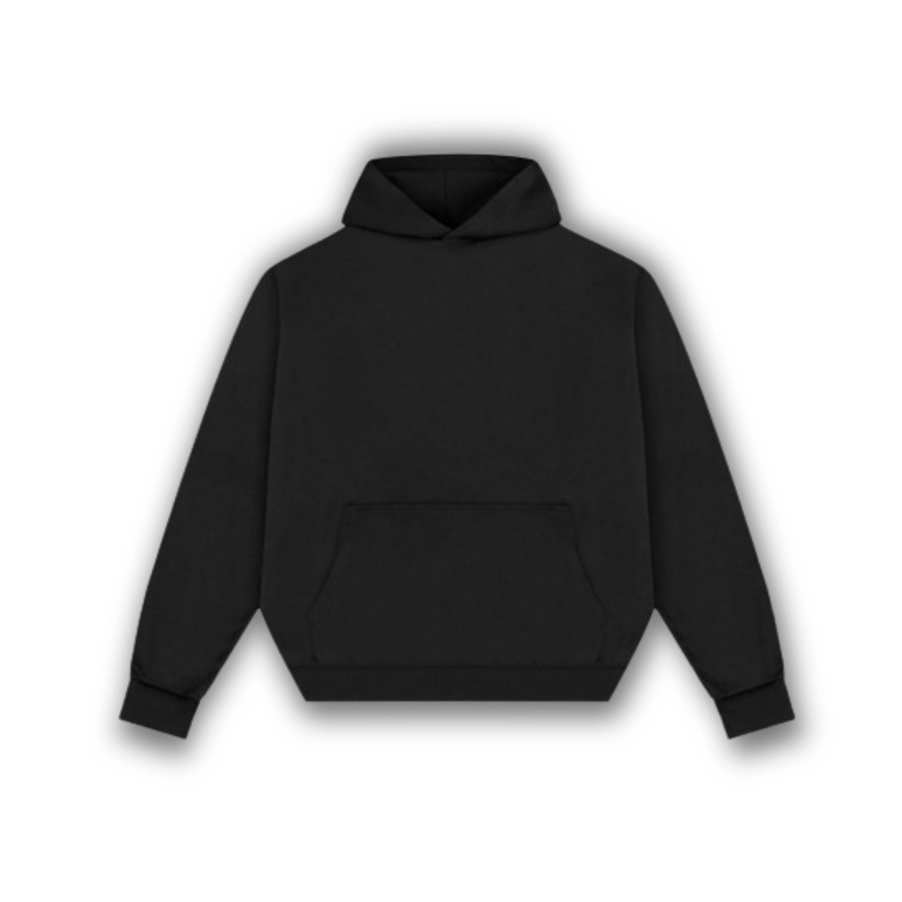 Bluza z kapturem w kolorze czarnym o pudełkowym kroju boxy. Z przodu znajduje się kieszeń typu kangurek, a przy rękawach i u dołu – prążkowane ściągacze. Przy kapturze nie ma sznurków ściągających, więc nie musisz martwić się, że zwisające troczki przysłonią Twój starannie zaprojektowany nadruk lub haft.