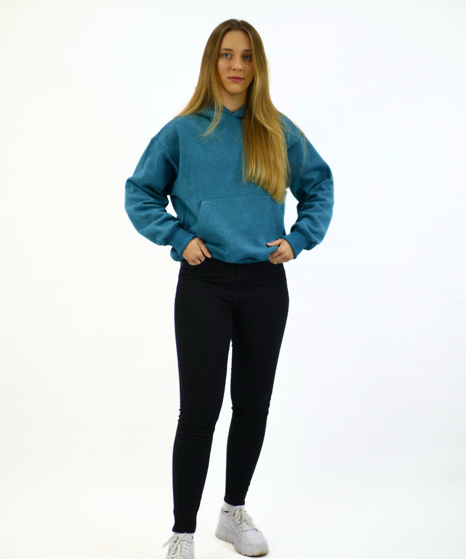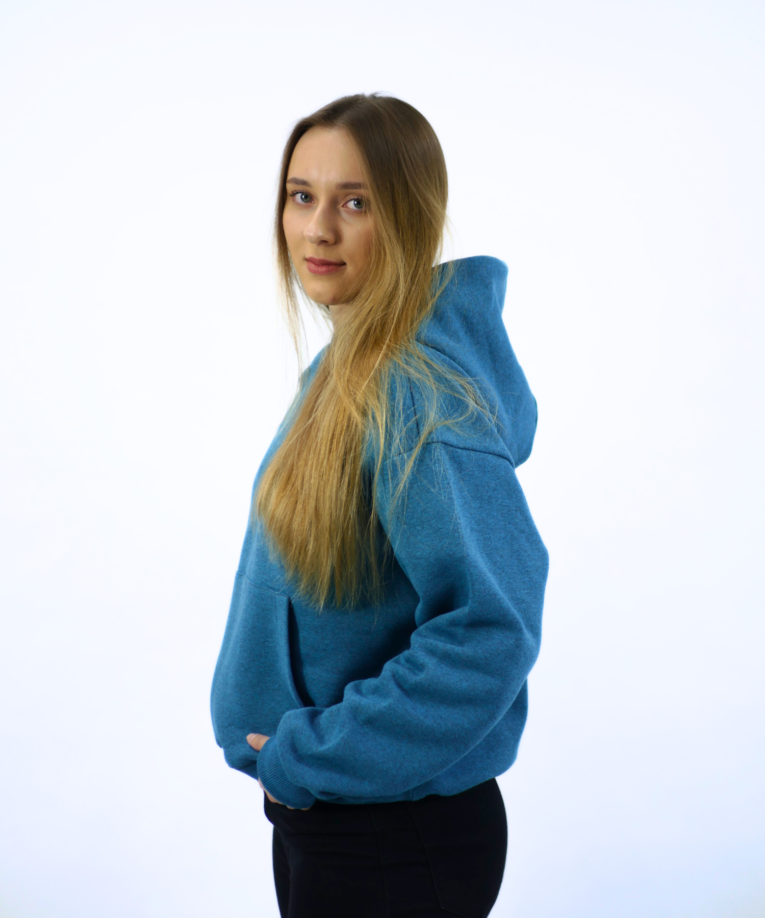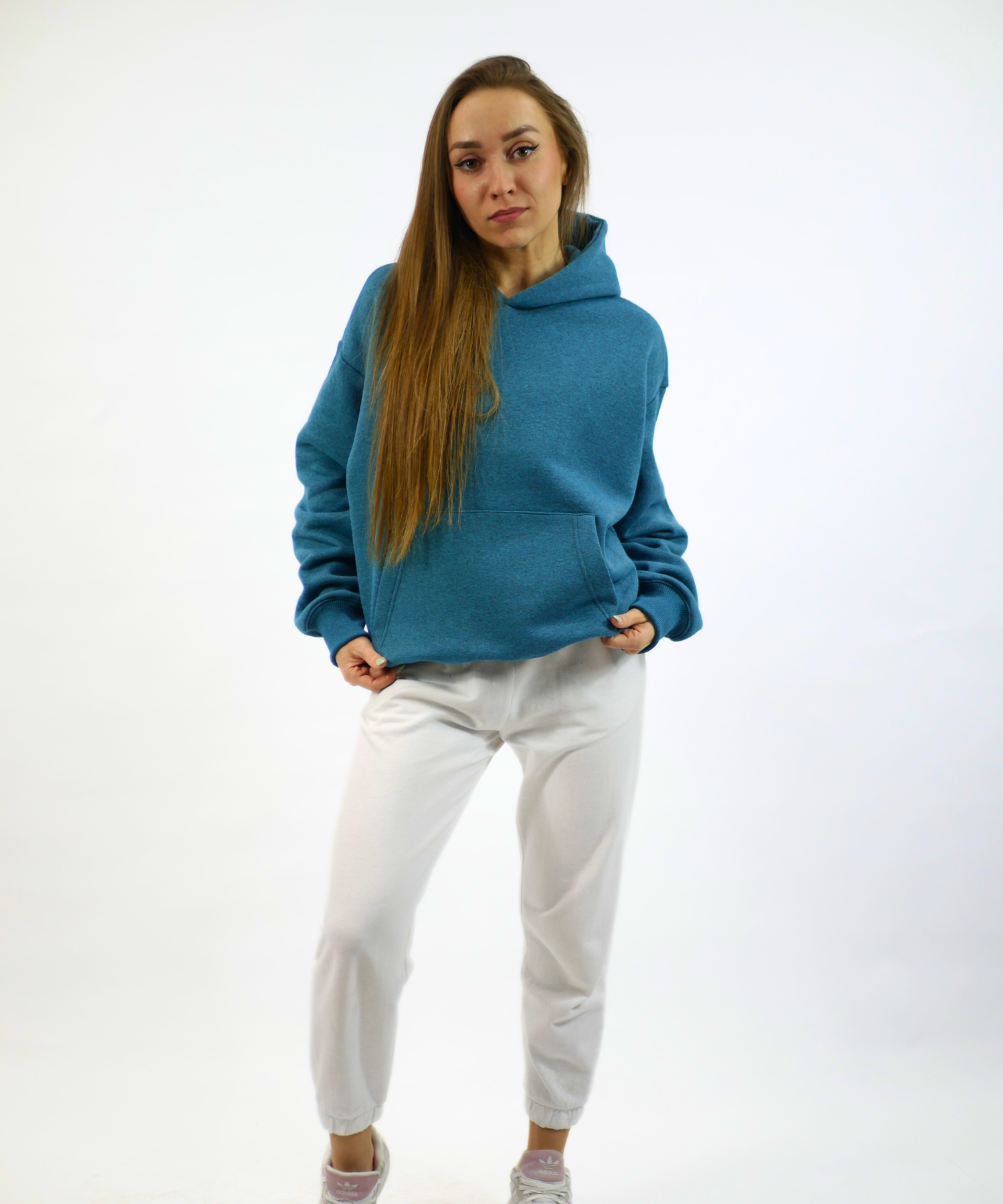 Bluza z kapturem w kolorze niebieski melanż o luźnym, pudełkowym kroju boxy. Przy kapturze nie ma sznurków ściągających, które mogłyby przykryć Twój starannie zaprojektowany nadruk lub haft. Z przodu znajduje się kieszeń typu kangurek, natomiast przy rękawach i u dołu – prążkowane ściągacze.