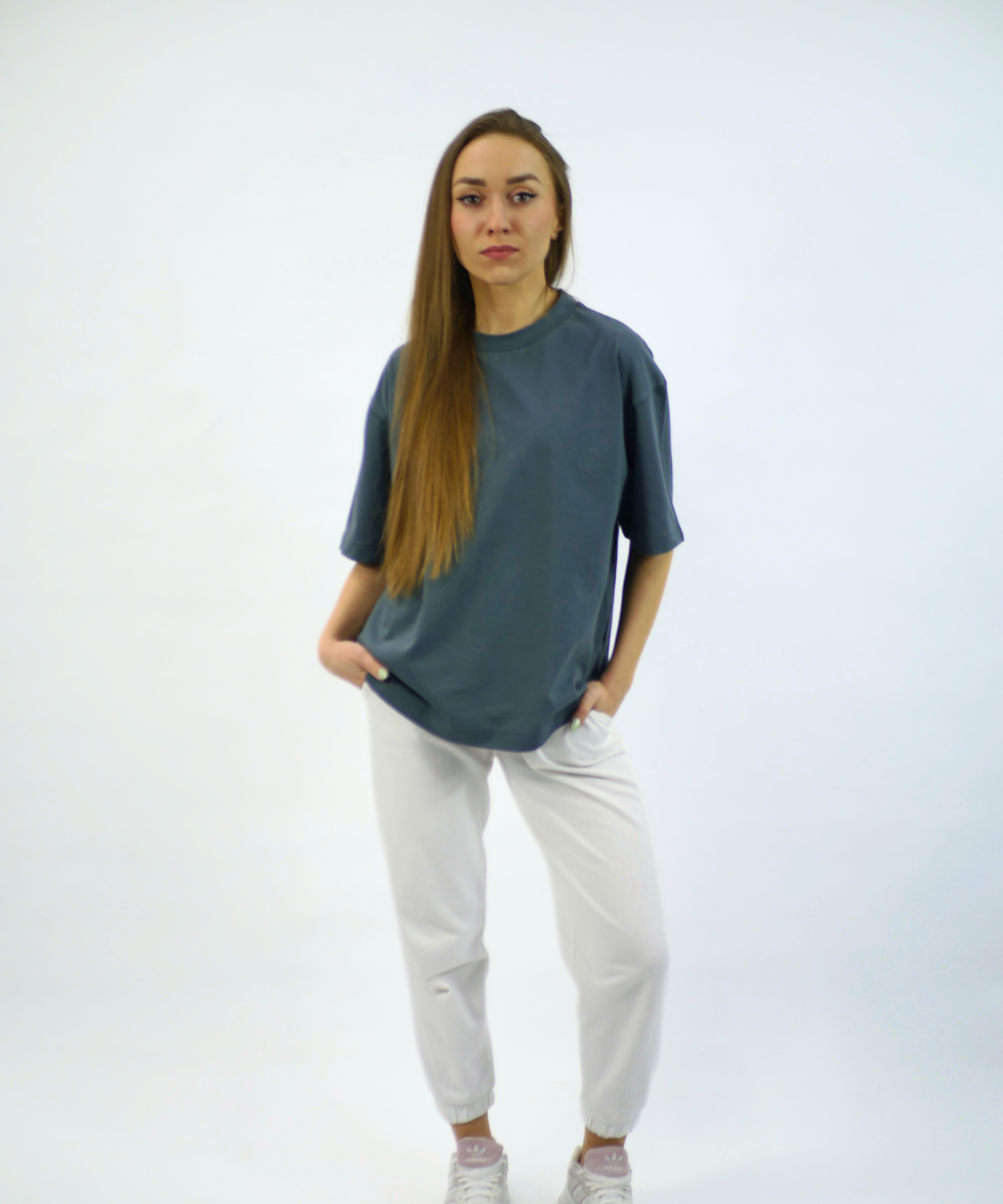 T-shirt w szarym kolorze z opuszczanym szwem na ramionach.